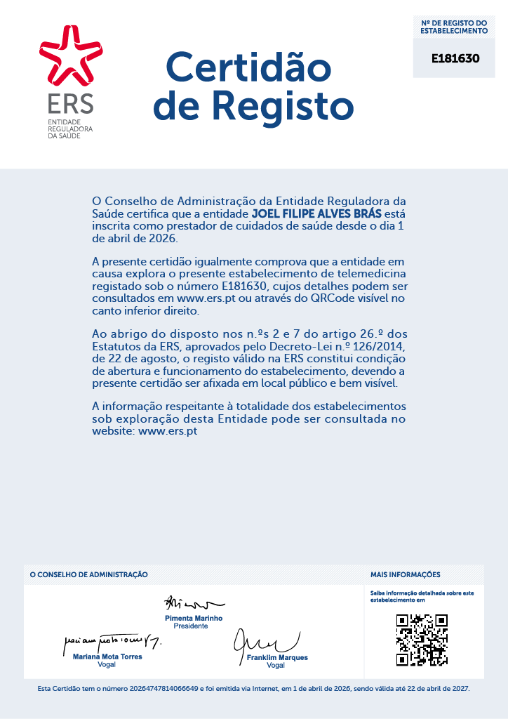 Nesta página é disponibilizada a respetiva certidão de registo, como expressão de transparência institucional e de compromisso com uma prática clínica formalmente enquadrada. Para quem procura consulta online de psiquiatria, videoconsulta de psiquiatria ou telemedicina em Portugal, este é um elemento objetivo de verificação e confiança.